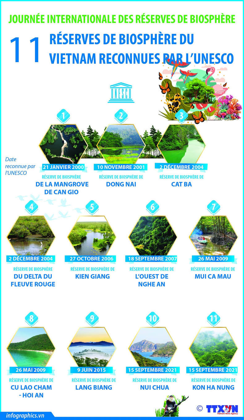 Le Vietnam compte actuellement 11 réserves de biosphère reconnues par l’UNESCO, couvrant une superficie totale de plus de 4,65 millions d’hectares répartis dans 12 provinces et villes, ce qui le place au deuxième rang en Asie du Sud-Est après l’Indonésie.