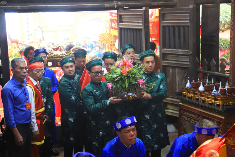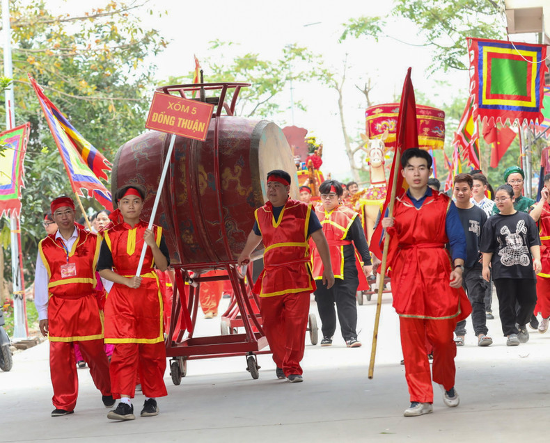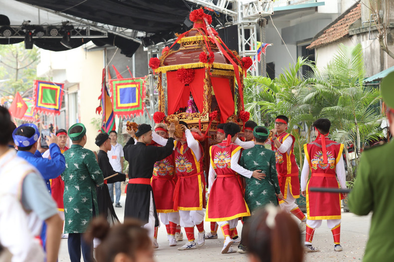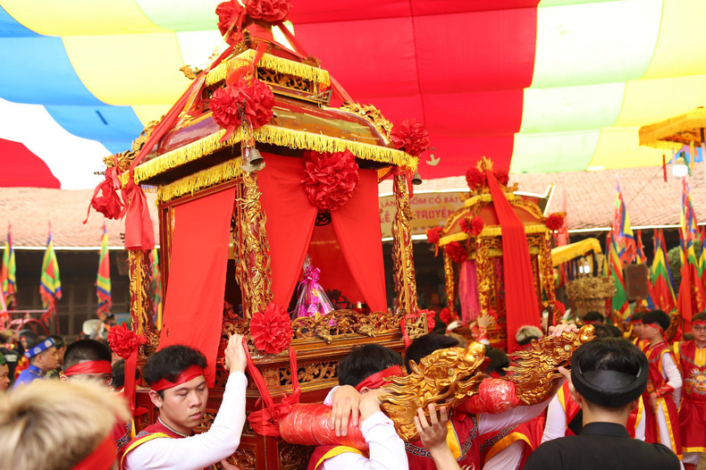 | La procession de l’eau et la procession des tablettes ont débuté au temple de Bat Tràng et se sont poursuivis jusqu’à la maison communale de Bat Tràng, avec des drapeaux et des palanquins. |