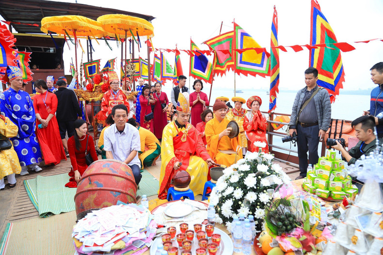 | Suite aux offrandes faites à la divinité du fleuve, le prêtre, agissant au nom des villageois, récupère l’eau sacrée de la rivière Rouge. Cette eau était ensuite filtrée à travers un tissu rouge et transportée jusqu’à la maison communale de Bat Tràng. |