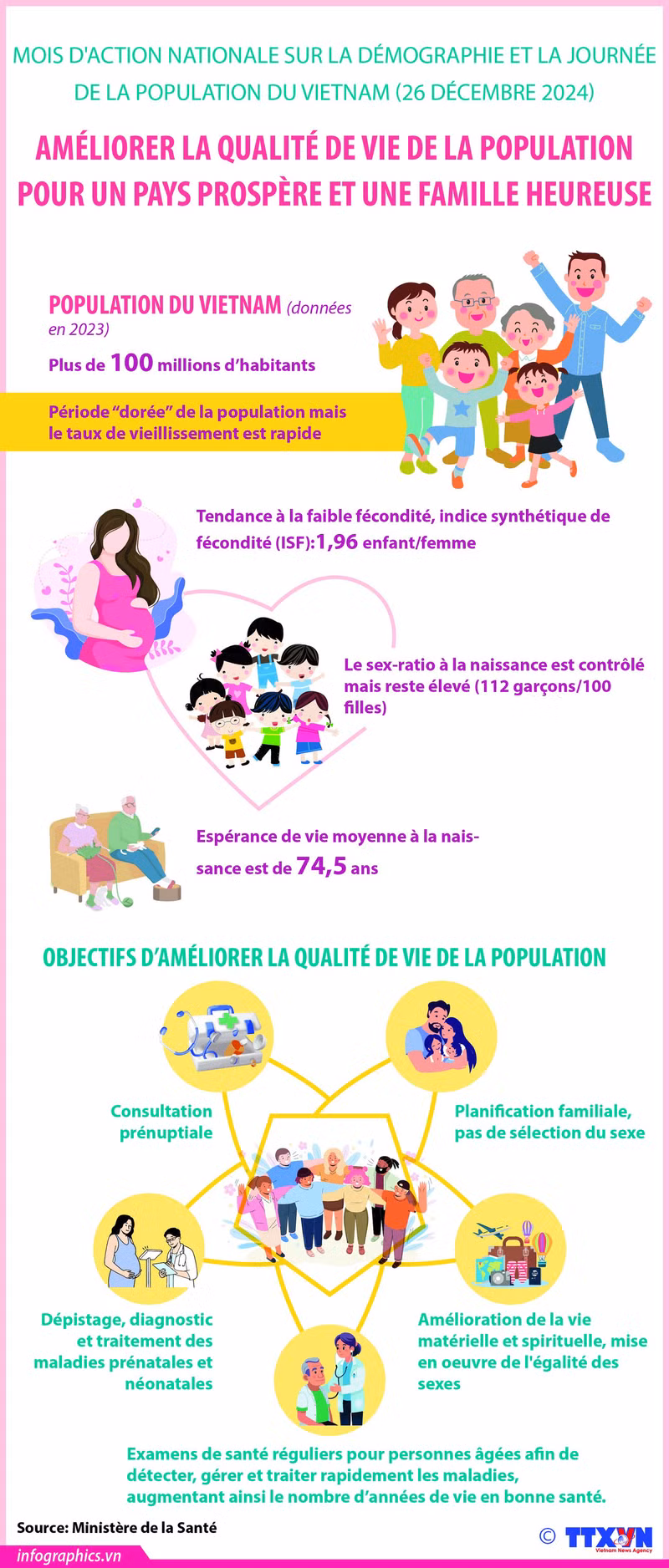 La tâche du travail sur la population dans les temps à venir est de continuer à améliorer la qualité de la population vietnamienne grâce à des conseils et des examens de santé prénuptiaux, du dépistage prénatal et néonatal et de la promotion de l’égalité des sexes.