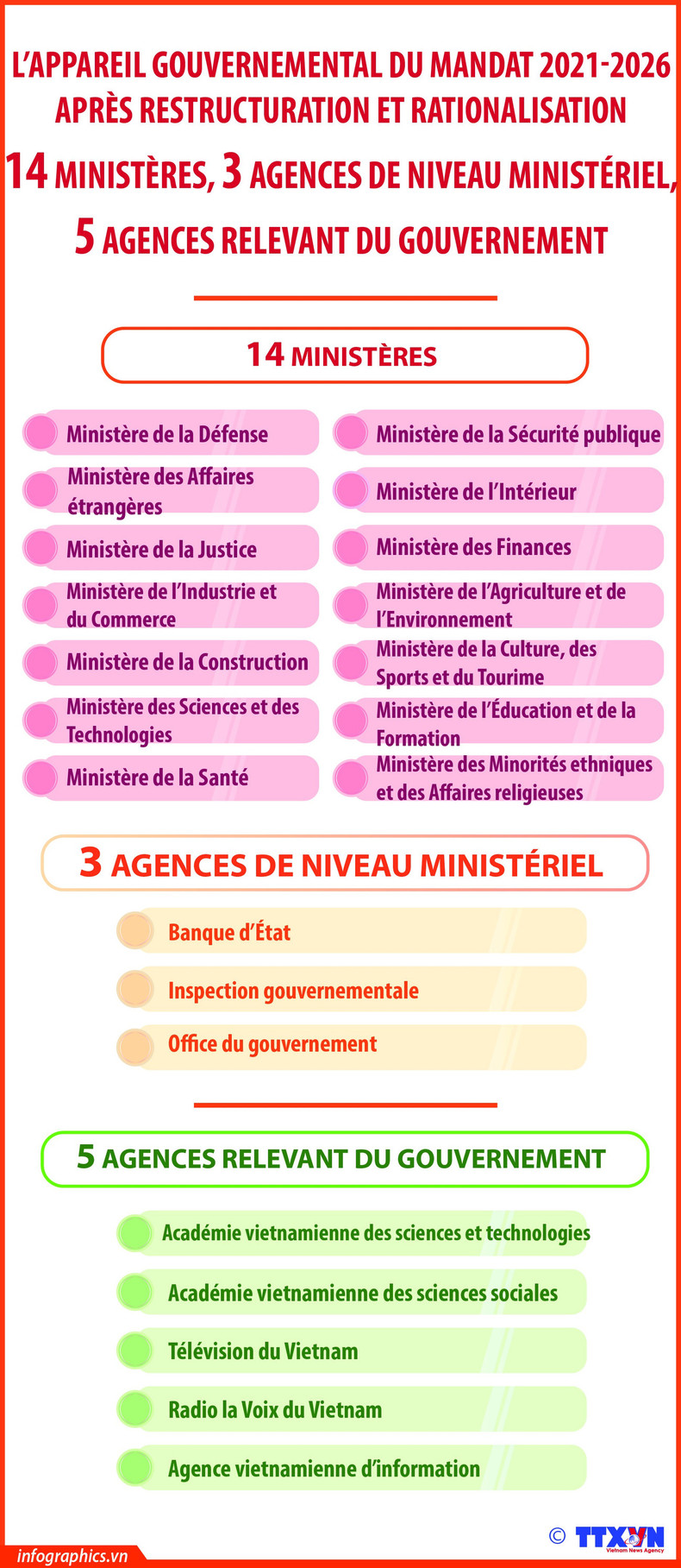 L’appareil gouvernemental du Vietnam (mandat 2021-2026), après restructuration et rationalisation, comprend 14 ministères et trois agences de niveau ministériel.