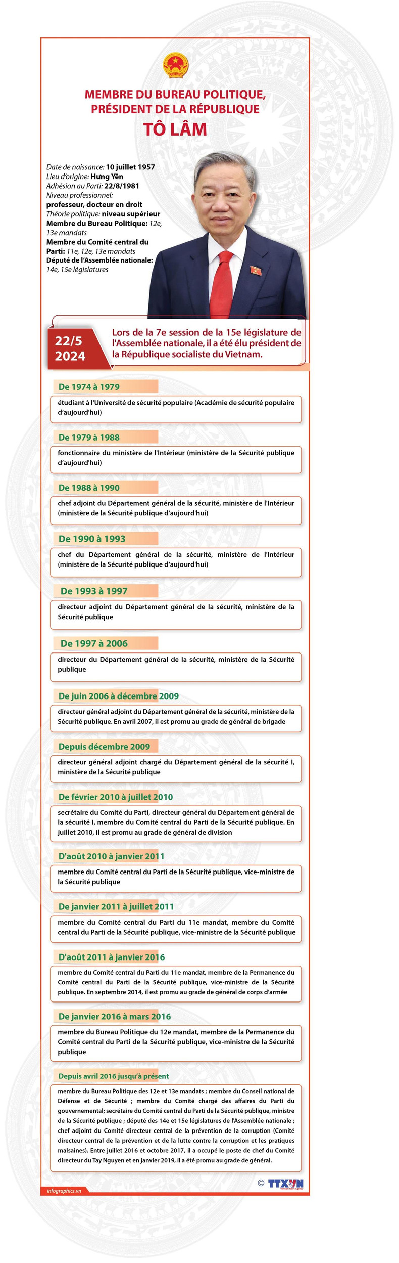 La 15e Assemblée nationale du Vietnam a élu le 22 mai Tô Lâm, membre du Bureau Politique, ministre de la Sécurité publique, député de la 15e législature de l'Assemblée nationale, Président de la République.