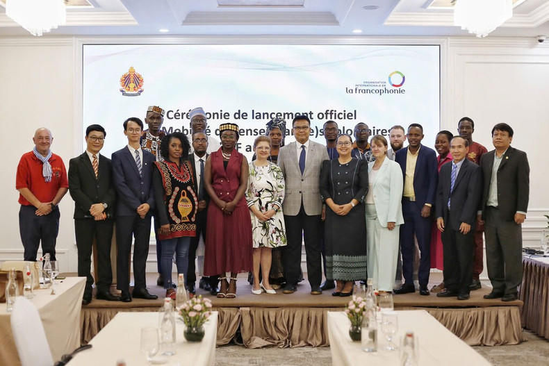 Photo de famille des participants à la cérémonie de lancement officiel de la Mobilité des enseignant(e)s volontaires de l'OIF au Cambodge. Photo : OIF/CVN
