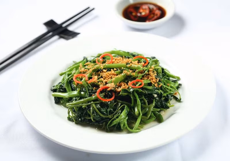 Le Rau muống xào tỏi est un favori parmi les aliments de base à Hanoï. Le plat met en valeur la sublime combinaison d’épinards d’eau douce, d’ail et de divers assaisonnements. Préparés dans un wok ou une grande poêle à frire, les épinards d’eau sont sautés à la perfection.