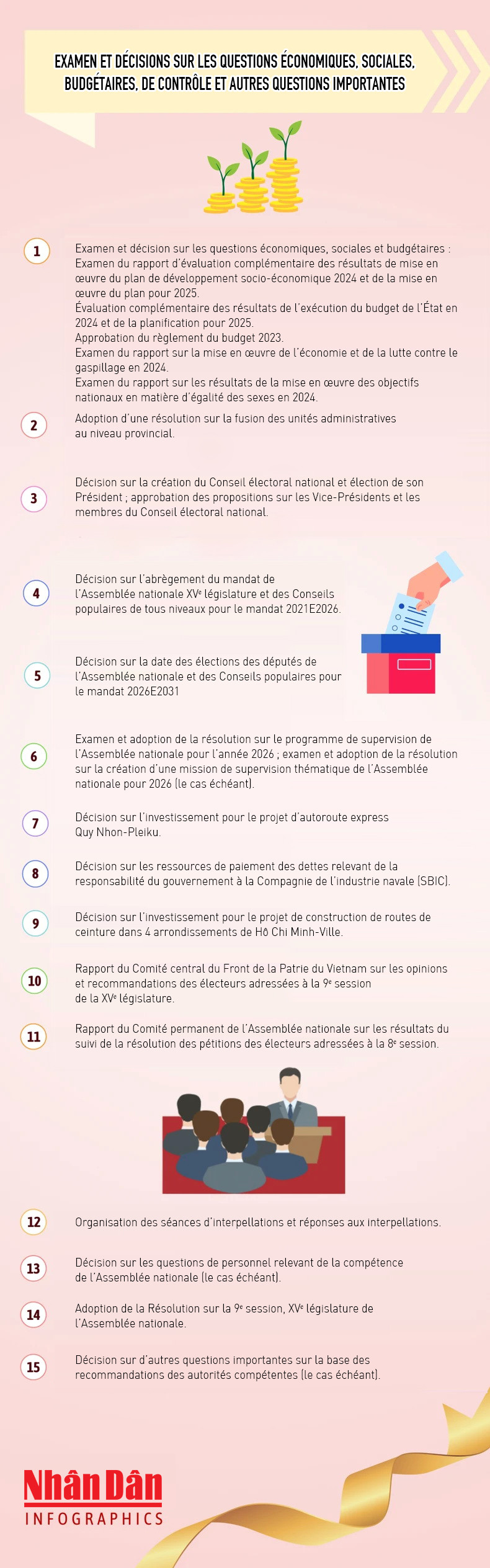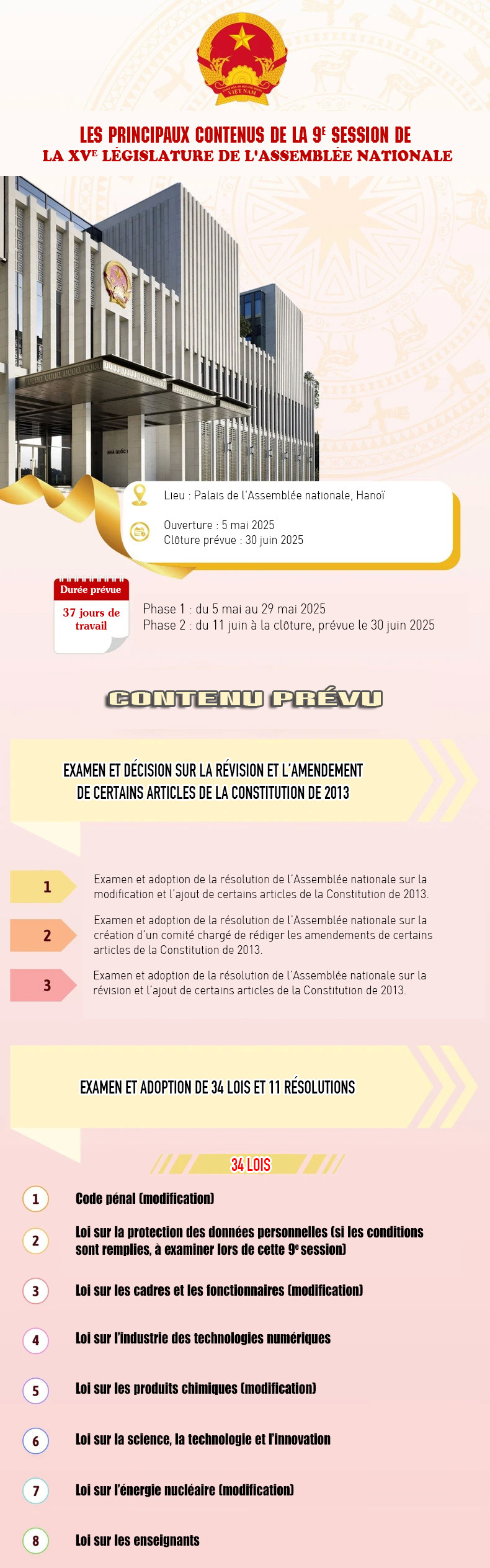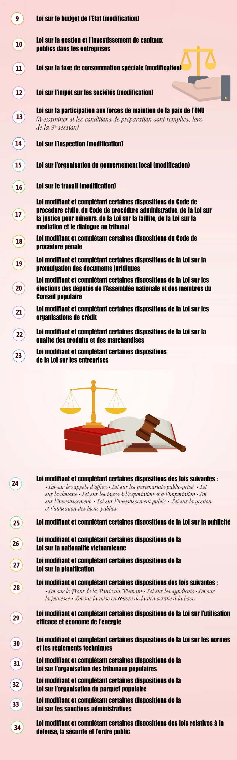 Lors de cette session, l’Assemblée nationale examinera et prendra des décisions sur 54 points relatifs aux travaux constitutionnels et législatifs, ainsi que sur 14 groupes de sujets concernant l’économie, la société, le budget de l’État, la supervision et d’autres questions importantes.
