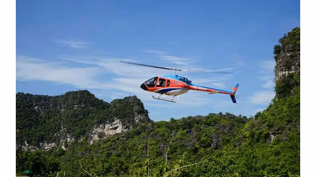 Un représentant de la Compagnie d'hélicoptères du Nord du Vietnam a déclaré que l'hélicoptère Bell 505, importé des États-Unis, avait été construit en 2019. Il s'agit d'un hélicoptère léger de quatre places, spécialisé dans les voyages et les visites. La cabine est conçue avec du verre transparent, permettant aux visiteurs de contempler de l'ensemble du paysage naturel majestueux.