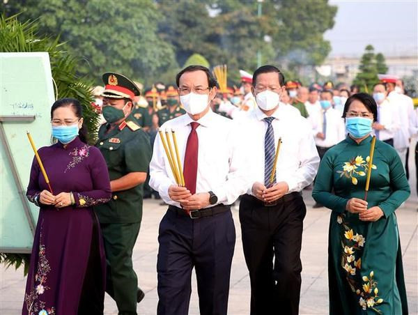 La délégation, qui composait des dirigeants du Comité municipal du Parti, du Conseil populaire municipal, du Comité populaire municipal, du Comité central du Front de la Patrie du Vietnam de Hô Chi Minh-Ville et était conduite par Nguyên Van Nên, secrétaire du Comité municipal du Parti, est allé offrir des fleurs et de l'encens au cimetière des martyrs Doi Khong Ten dans la ville de Thu Duc.