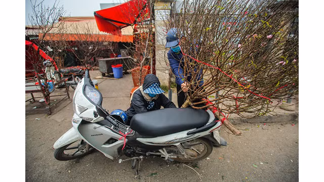 Des chauffeurs de taxi-moto livrent les branches des fleurs de pêchers directement chez les clients.