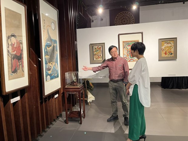 Le curateur Nguyên Thê Son présente les œuvres à une visiteuse. Photo : VNA.