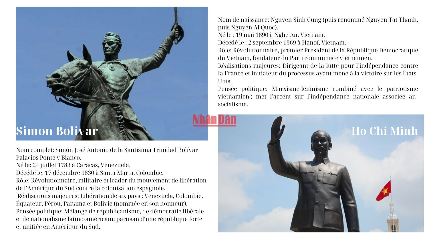 Et de même que l'Oncle Hô Chi Minh a vaincu trois empires, Simón Bolívar et les patriotes ont libéré cinq pays du colonialisme espagnol.