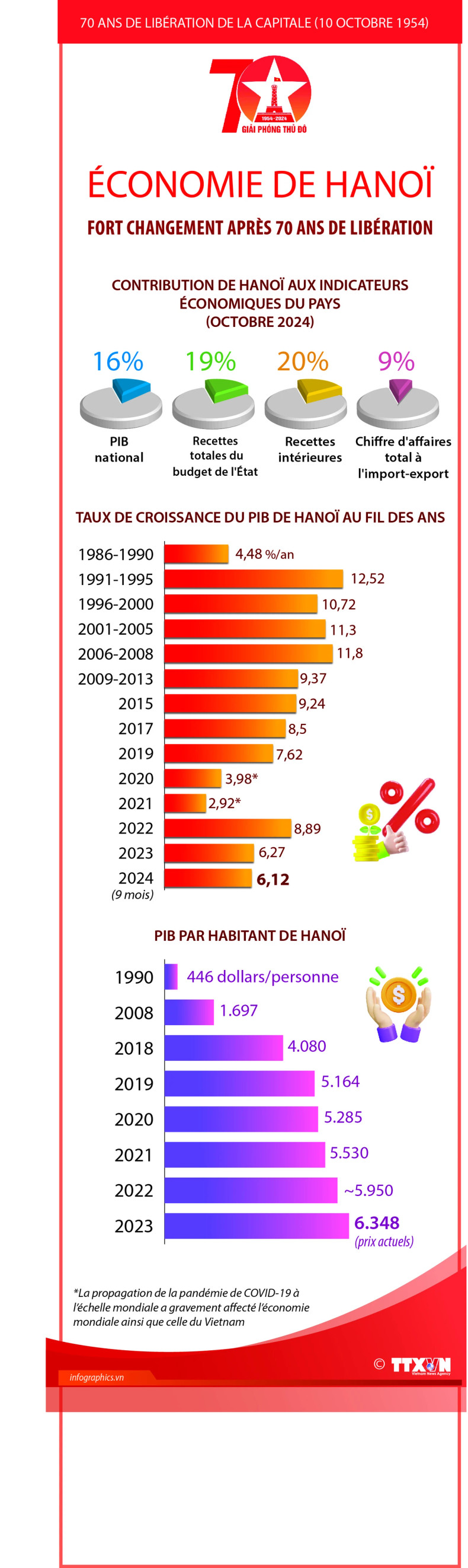 D'une ville qui a subi de nombreuses blessures laissées par la guerre, Hanoï connaît aujourd'hui un fort développement. L'économie de Hanoï a connu une croissance continue à un niveau élevé, contribuant à 16% du PIB et à 19% des recettes budgétaires nationales.