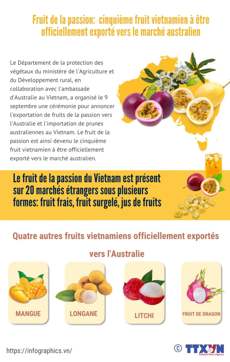 Le Département de la protection des végétaux du ministère vietnamien de l'Agriculture et du Développement rural, en collaboration avec l'ambassade d'Australie au Vietnam, a organisé le 9 septembre une cérémonie pour annoncer l'exportation de fruits de la passion vers l'Australie et l'importation de prunes australiennes au Vietnam.