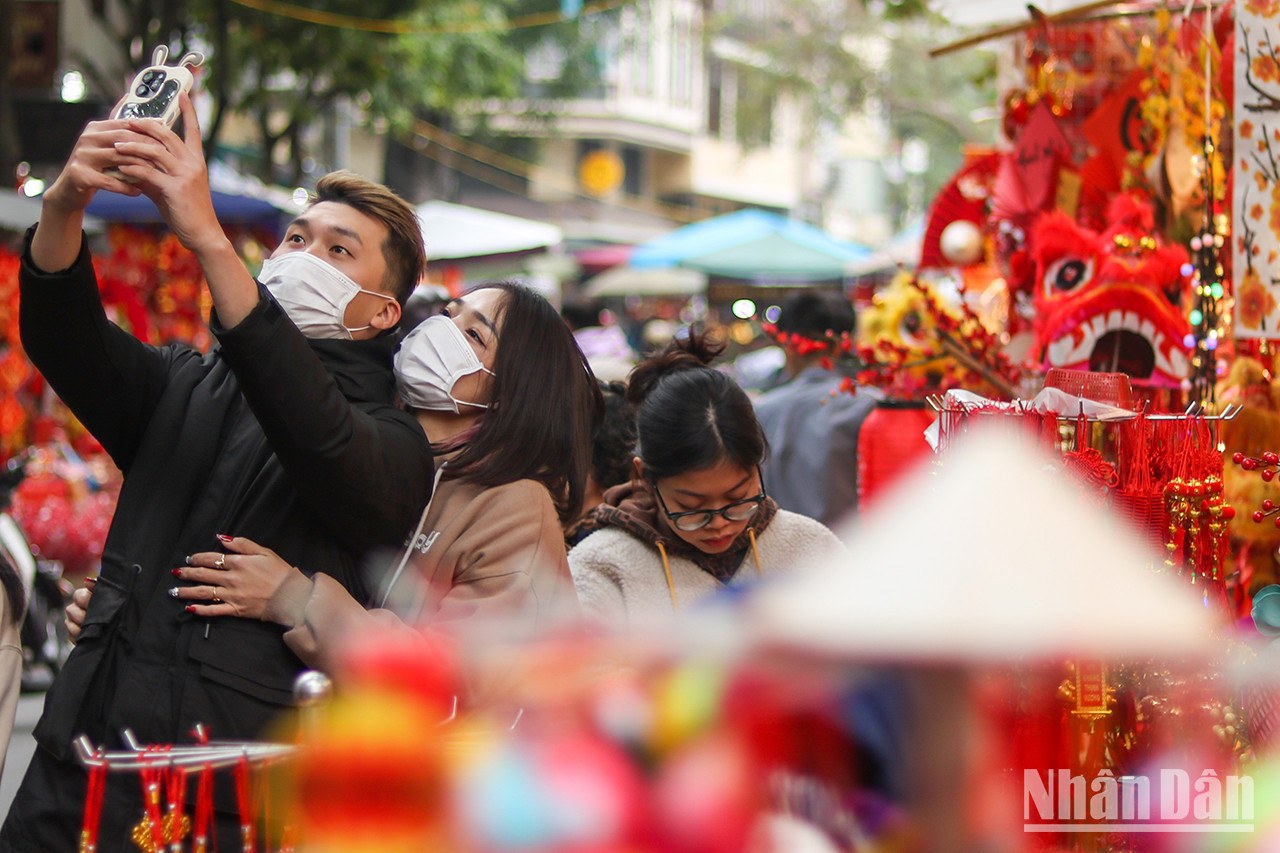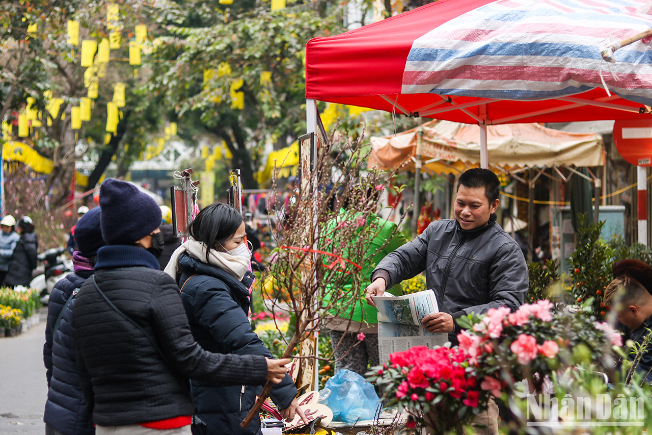 | Les gens viennent ici non seulement pour faire des achats, mais aussi pour profiter de l’atmosphère printanière. Les fleurs de pêcher éclosent précocement, signalant que le Têt approche. |