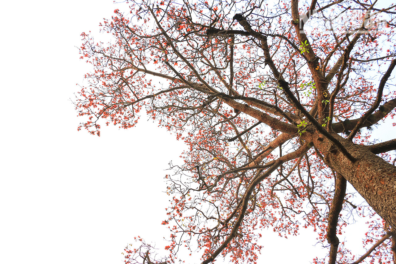 | Lorsque la bombax ceiba fleurit, les feuilles vertes tombent pour laisser place à une belle couleur rouge. L'arbre « hoa gạo » vu de loin ressemble à un feu brûlant. |
