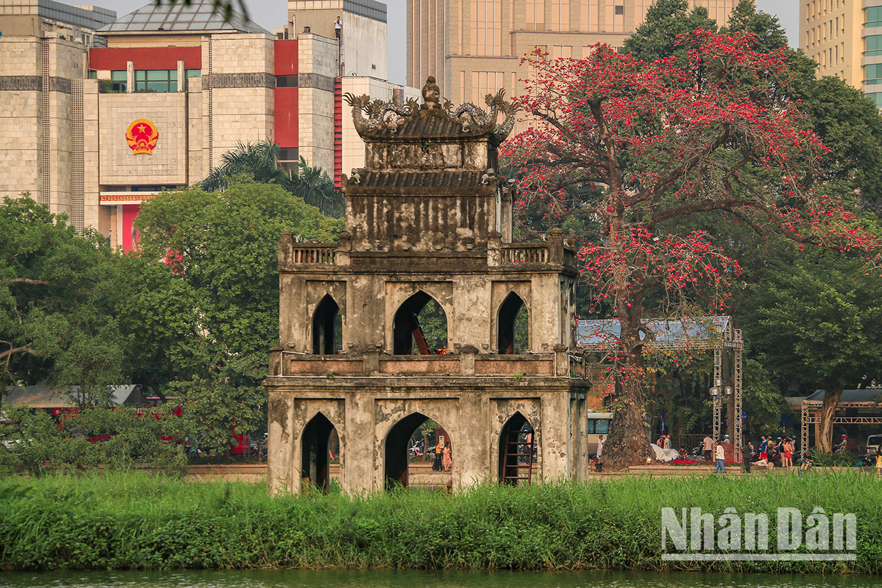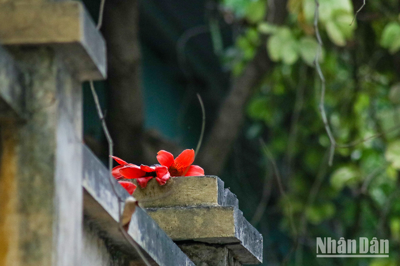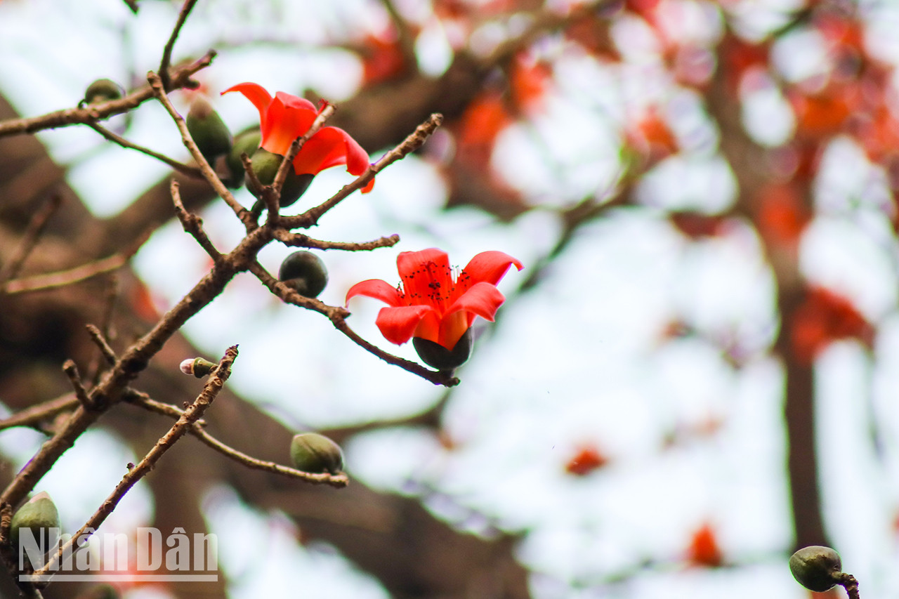 | L'arbre de bombax ceiba centenaire situé au Musée national d'Histoire, n° 1, rue Tràng Tiên, dans l’arrondissement de Hoàn Kiêm, à Hanoï, a commencé à fleurir, attirant tous les regards des gens lors de leur passage. |