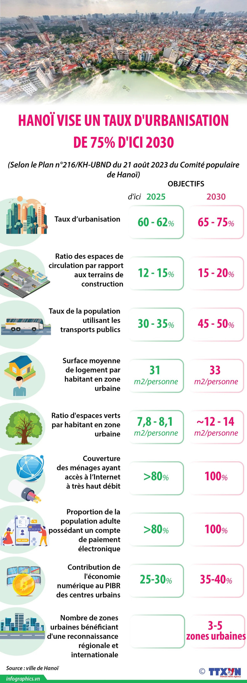 Hanoï, capitale du Vietnam, vise à atteindre un taux d'urbanisation de 60 à 62% d'ici 2025 et de 65 à 75% d'ici 2030, et à disposer de 3 à 5 zones urbaines bénéficiant d'une reconnaissance régionale et internationale.