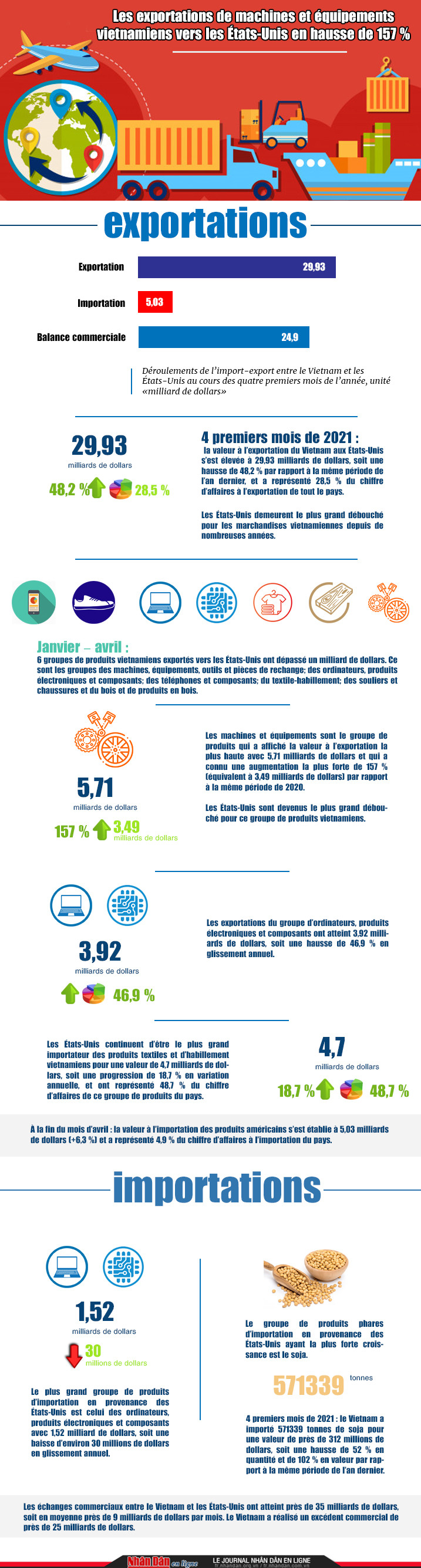 Nhân Dân enligne - Selon les dernières données du Département général des Douanes du Vietnam, le chiffre d’affaires à l’import-export entre le Vietnam et les États-Unis a atteint en moyenne près de 9 milliards de dollars par mois et le Vietnam maintient un important excédent commercial.