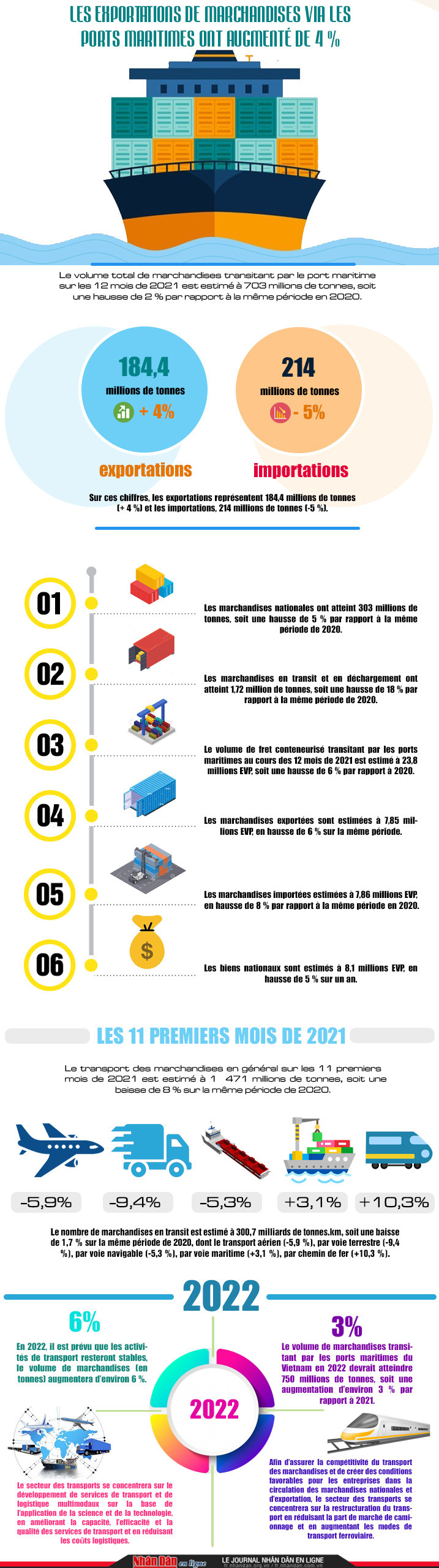 Nhân Dân en ligne - Selon les informations du ministère vietnamien des Transports, le volume total de marchandises transitant par les ports maritimes en 2021 a augmenté de 2 % par rapport à l’année précédente et les exportations ont augmenté de 4 %.