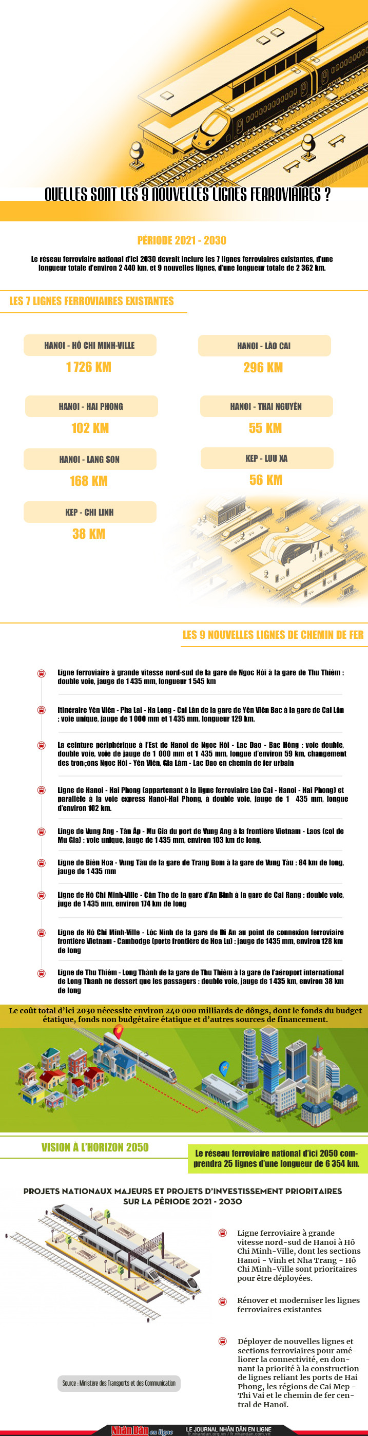 Nhân Dân en ligne - Selon l’aménagement du réseau ferroviaire pour la période 2021 - 2030, récemment approuvé par le Premier ministre vietnamien, en plus des 7 lignes existantes, 9 nouvelles lignes seront prochainement construites.