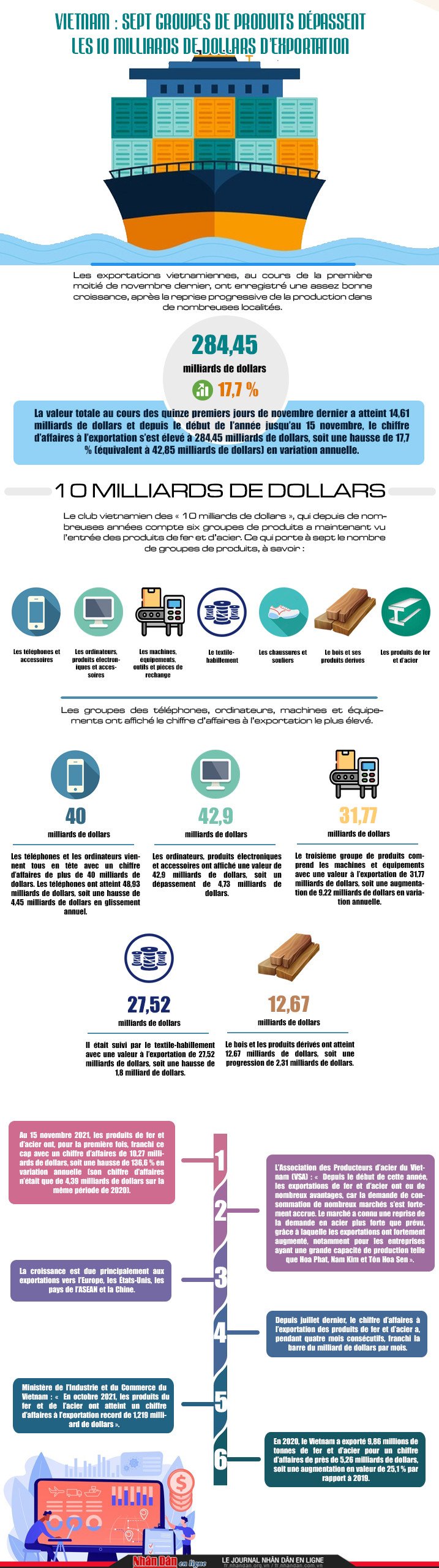Nhân Dân enligne - Avec la forte augmentation des exportations de produits de fer et d’acier, au 15 novembre 2021, le Vietnam comptait sept produits d’exportation affichant un chiffre d’affaires de plus de 10 milliards de dollars.