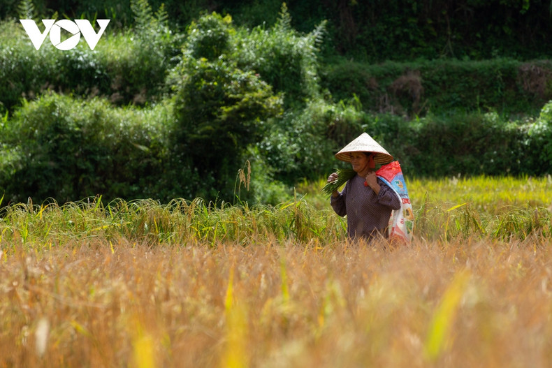 Pendant la saison des récoltes de riz mûr, les rives du Quây Son se parent d’un jaune éclatant.