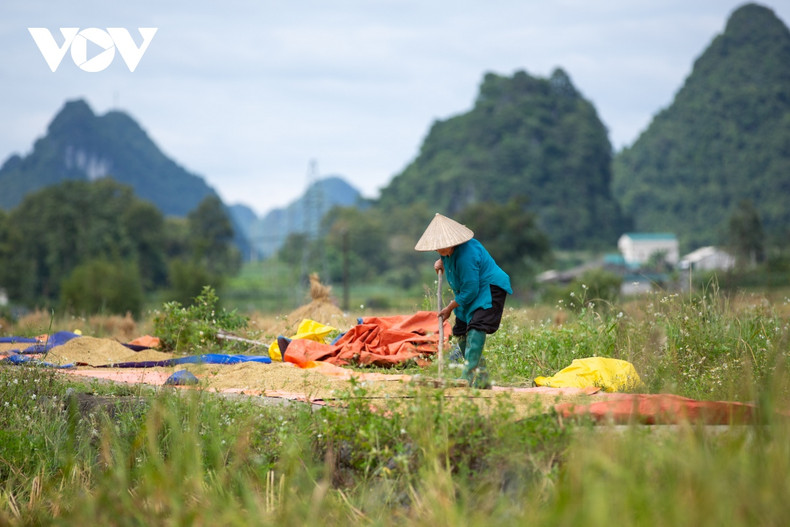 Les habitants étalent le riz directement dans les champs, avec les montagnes en arrière-plan.