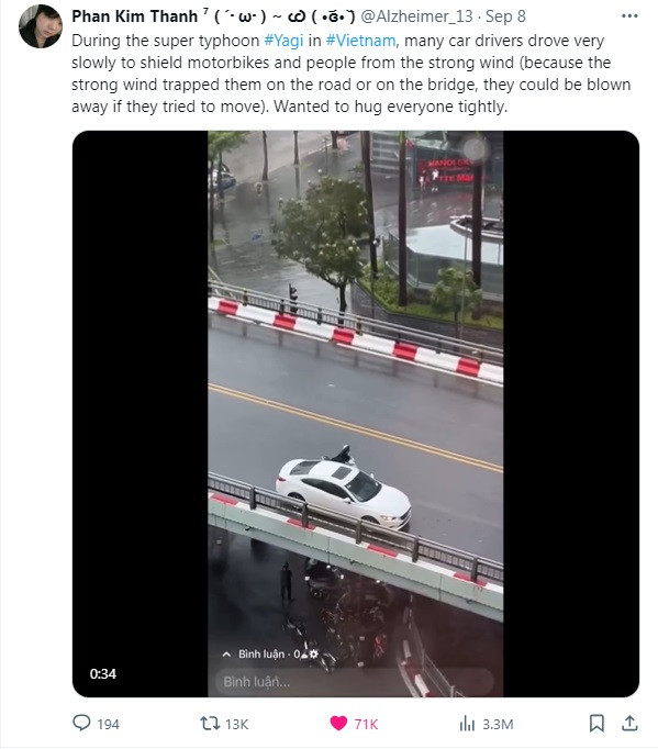 Sur Instagram, le compte @Yourtubudd a partagé une vidéo montrant des voitures aidant des motocyclistes à traverser un pont sous un vent violent. Ce compte a souligné : « La tempête Yagi peut apporter de nombreux défis, mais aujourd’hui, nous avons vu la véritable essence de la culture vietnamienne : solidarité et résilience. »