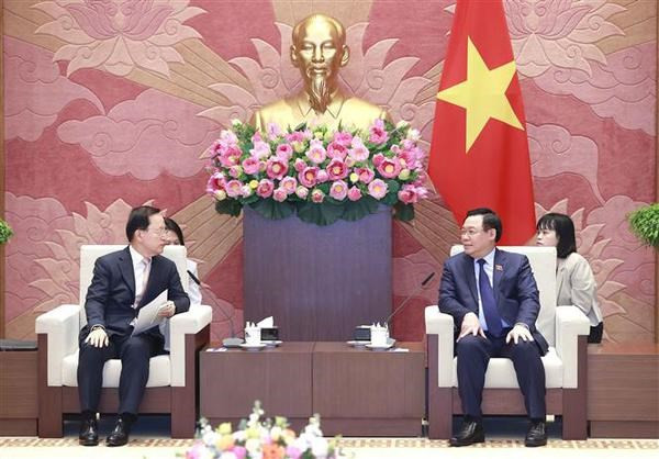 Le Président de l’AN du Vietnam, Vuong Dinh Huê (à droite) reçoit le directeur général des finances du groupe Samsung Park Hark Kyu. Photo : VNA.