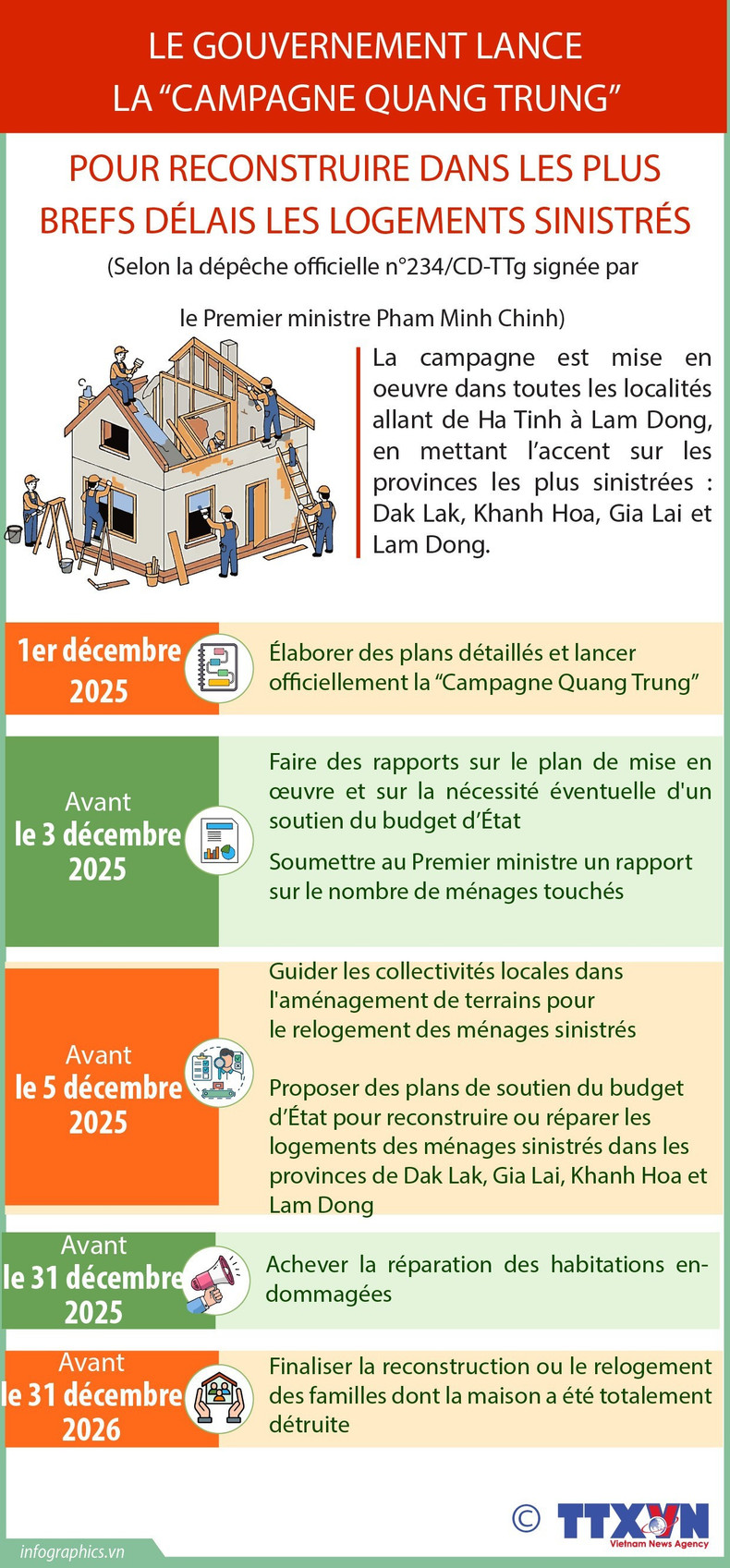 Le PM vietnamien Pham Minh Chinh a promulgué la dépêche officielle n°234/CD-TTg, lançant la “Campagne Quang Trung” destinée à mobiliser l’ensemble des forces pour reconstruire et réparer dans les plus brefs délais les logements des familles lourdement touchées par les catastrophes naturelles.