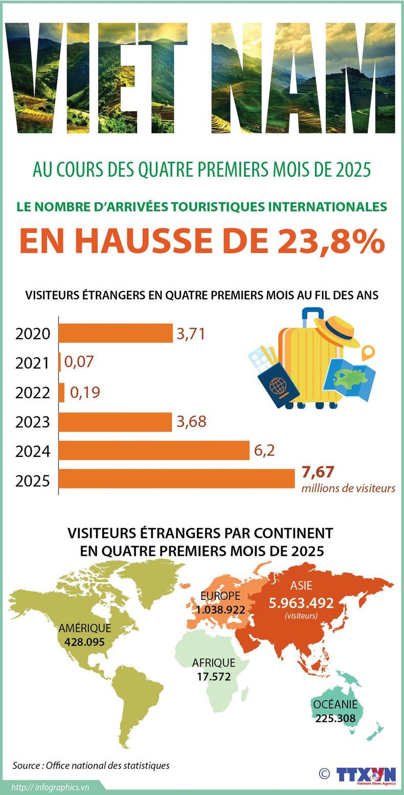 Au cours des quatre premiers mois de 2025, le nombre de visiteurs étrangers au Vietnam a atteint 7,67 millions, soit une augmentation de 23,8 % par rapport à la même période de l'année dernière, grâce à des politiques de visas favorables et à une forte promotion du tourisme.