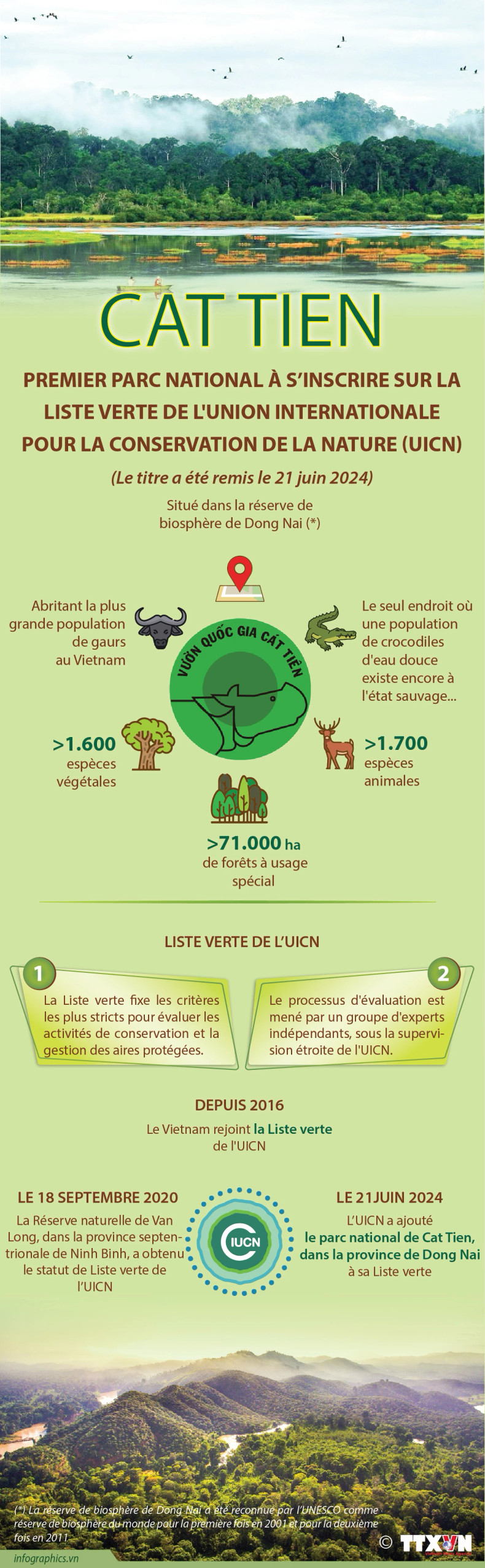 L'Union internationale pour la conservation de la nature (UICN) a ajouté le parc national de Cat Tien, dans la province de Dong Nai (au Sud du Vietnam), à sa Liste verte des aires protégées et conservées, ce qui en fait le premier parc national et le deuxième zone protégée du Vietnam de recevoir cette distinction. Le certificat a été remis le 21 juin.