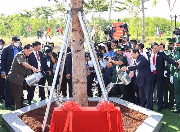 Auparavant, les deux Premiers ministres du Vietnam et du Cambodge ont planté un arbre d’amitié et visité la stèle commémorative à Loc Tan.