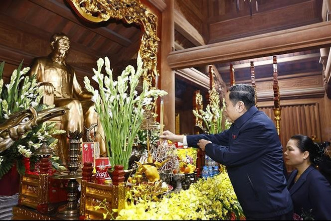 Le président de l'AN dépose de l’encens à la maison communale de Tân Trào, lieu où se tint le Congrès national du Peuple ayant décidé de la Révolution d’Août 1945. Photo : VNA.