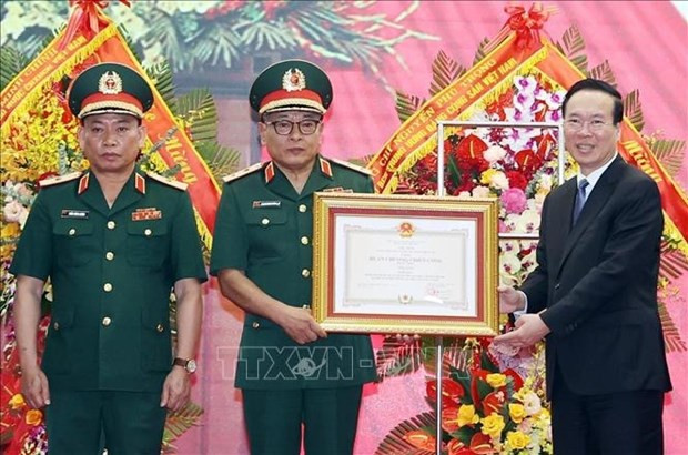 Le Président vietnamien, Vo Van Thuong (1er, à droite), remet l’Ordre du mérite militaire de première classe au Département général N°2 du Ministère de la Défense. Photo : VNA.