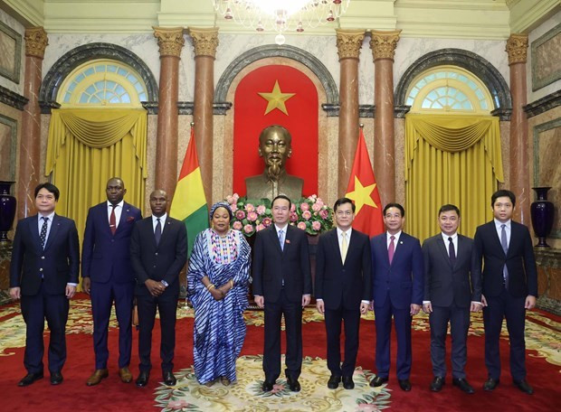 Le Président Vo Van Thuong (au centre) reçoit l'ambassadrice guinéenne, Aminata Koita (4e, de gauche à droite). Photo : VNA.
