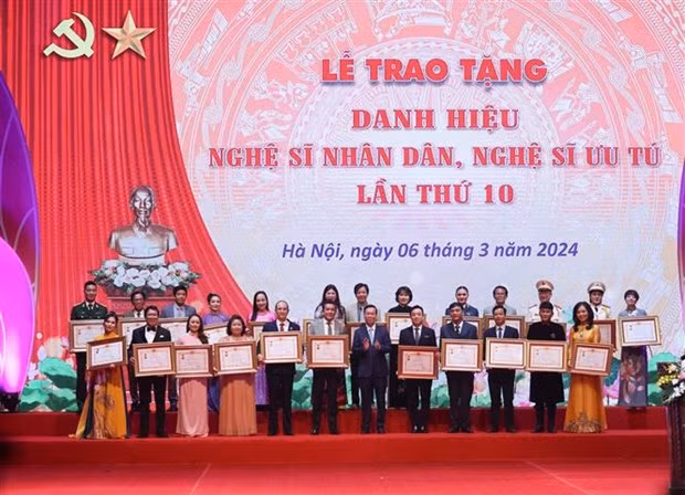 Le Président Vo Van Thuong remet le titre d’"Artiste du peuple" aux artistes émérites, à Hanoi, le 6 mars. Photo : VNA