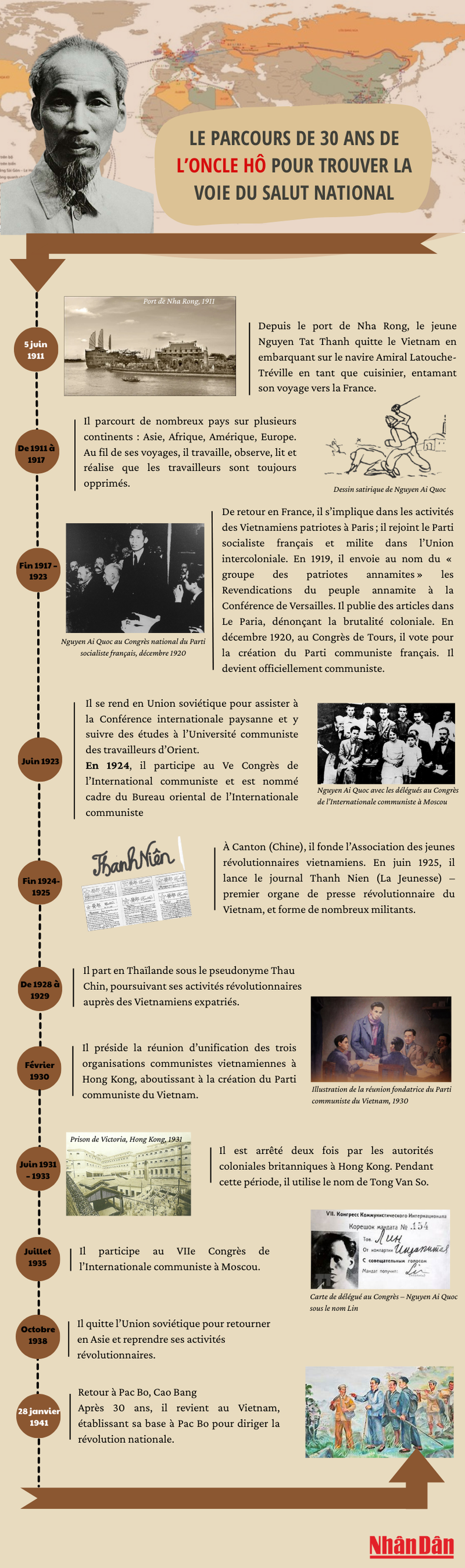 De Paris à Moscou, de Canton à Bangkok, en passant par Hong Kong, il forma des militants, publia des journaux et joua un rôle déterminant dans la fondation du Parti communiste du Vietnam en 1930.