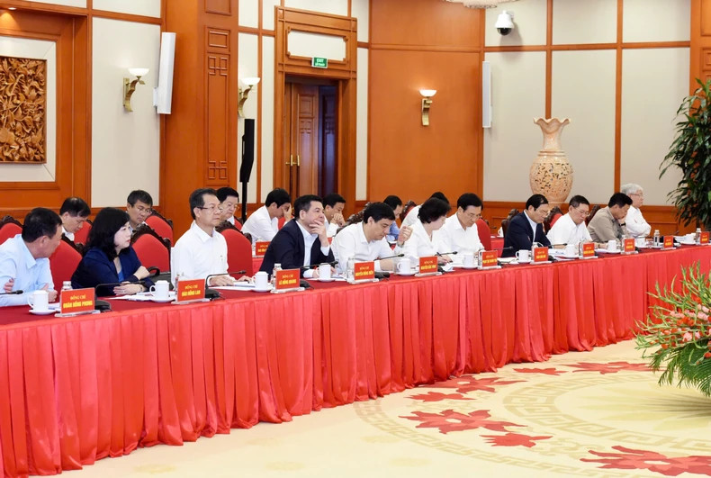 Lors de la séance de travail, Pham Minh Chinh, membre du Politburo, Premier ministre, chef du sous-comité socio-économique, et Nguyen Chi Dung, membre du Comité central du PCV, ministre du Plan et de l'Investissement, permanent du sous-comité, chef du groupe de rédaction socio-économique, ont informé du processus de complément et de finalisation du projet de rapport évaluant 5 ans de mise en œuvre de la Stratégie décennale de développement socio-économique pour 2021 - 2030, orientations et tâches pour le développement socio-économique pour 2026 - 2030, depuis le 10e Plénum, ainsi que de certains scénarios de croissance économique élevée en 2025 et sur la période 2026 - 2030.