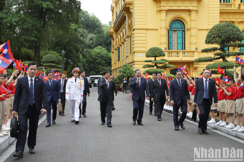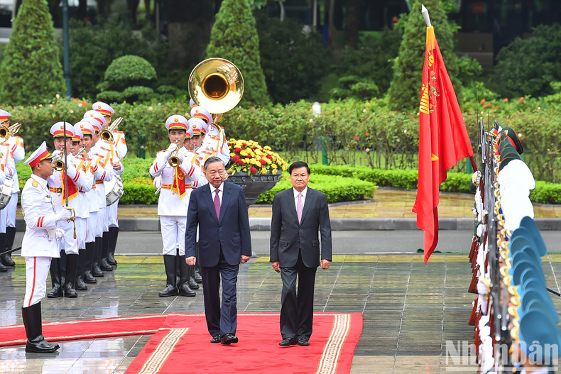La cérémonie d'accueil officielle du dirigeant lao et de son épouse a eu lieu solennellement au Palais présidentiel, sous la présidence du leader du PCV et président vietnamien To Lam et de son épouse.