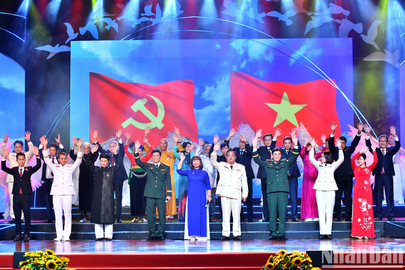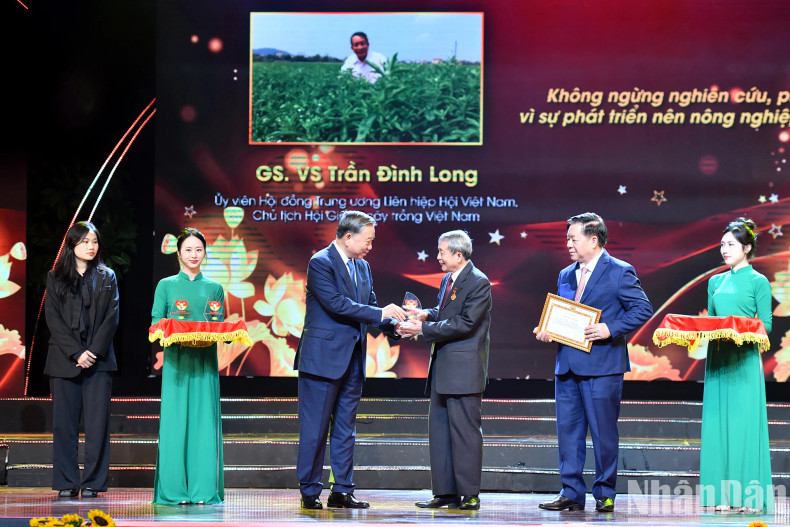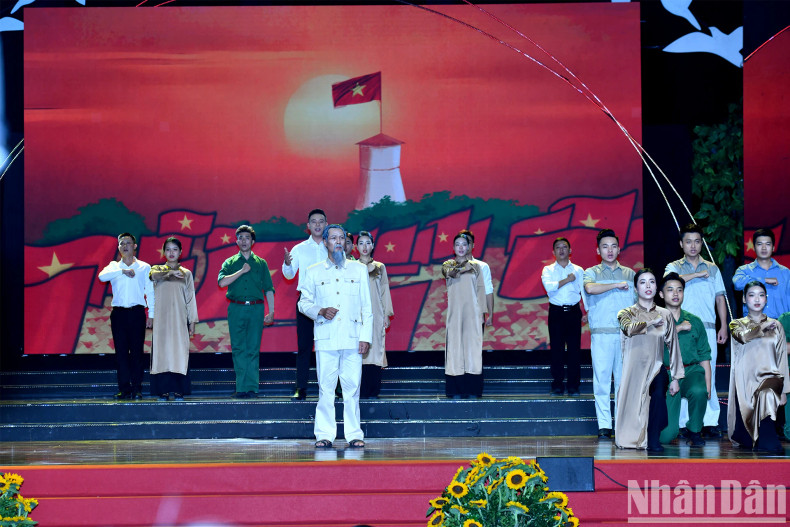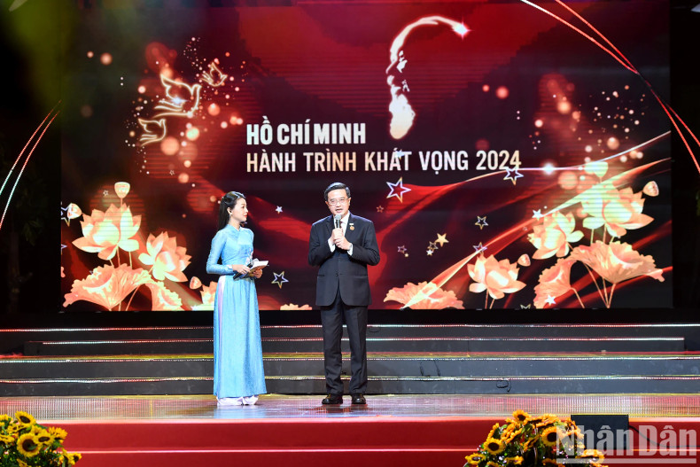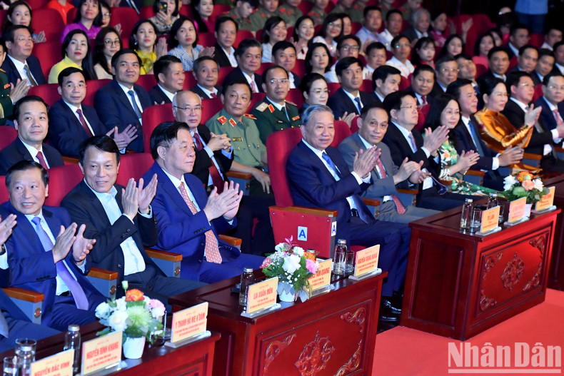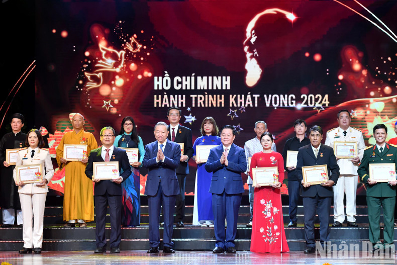 Lors du spectacle, le secrétaire général du Parti To Lam et chef de la Commission centrale de la sensibilisation et de l’éducation du Parti, Nguyen Trong Nghia, ont décerné des certificats et des logos honorant 25 exemples nationaux typiques dans l'étude et le suivi de l'idéologie, de l'éthique et du style de Ho Chi Minh.