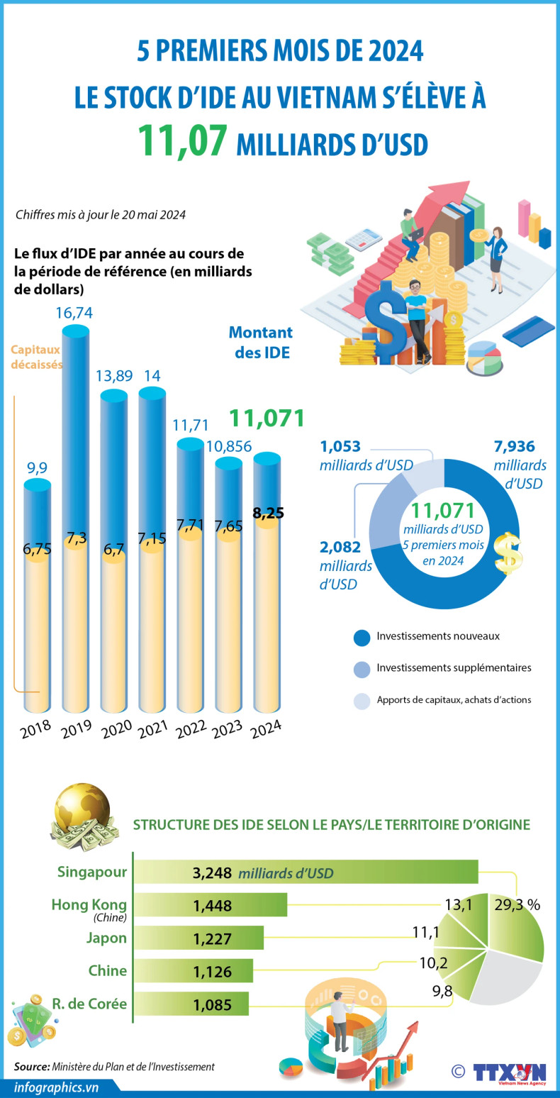 Selon les chiffres mis à jour le 20 mai 2024 par le ministère du Plan et de l’Investissement, le montant des investissements nouveaux, des investissements supplémentaires, des apports de capitaux, des acquisitions d’actions des investisseurs étrangers au Vietnam a atteint 11,071 milliards de dollars en cinq premiers mois de 2024, soit une augmentation de près de 2% en variation annuelle.