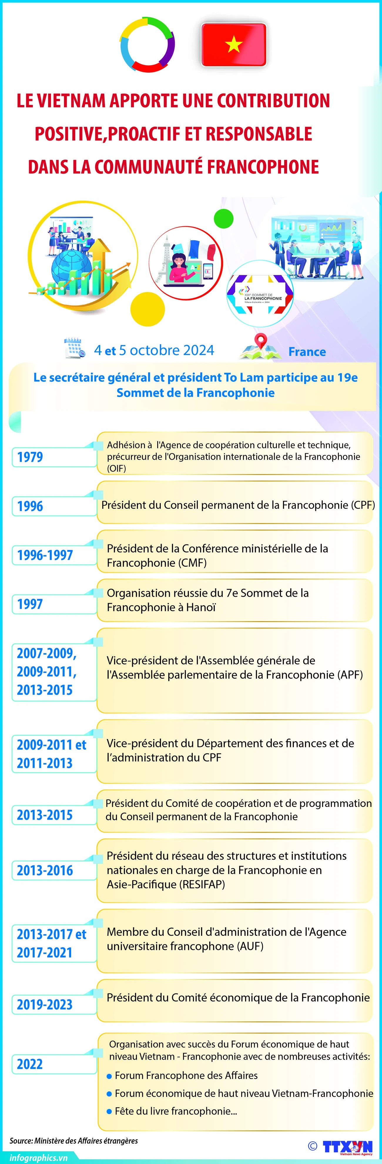 La communauté francophone valorise le rôle et les contributions du Vietnam, considère le Vietnam comme un modèle de développement socio-économique et comme le centre des activités de coopération francophone dans la région Asie-Pacifique.