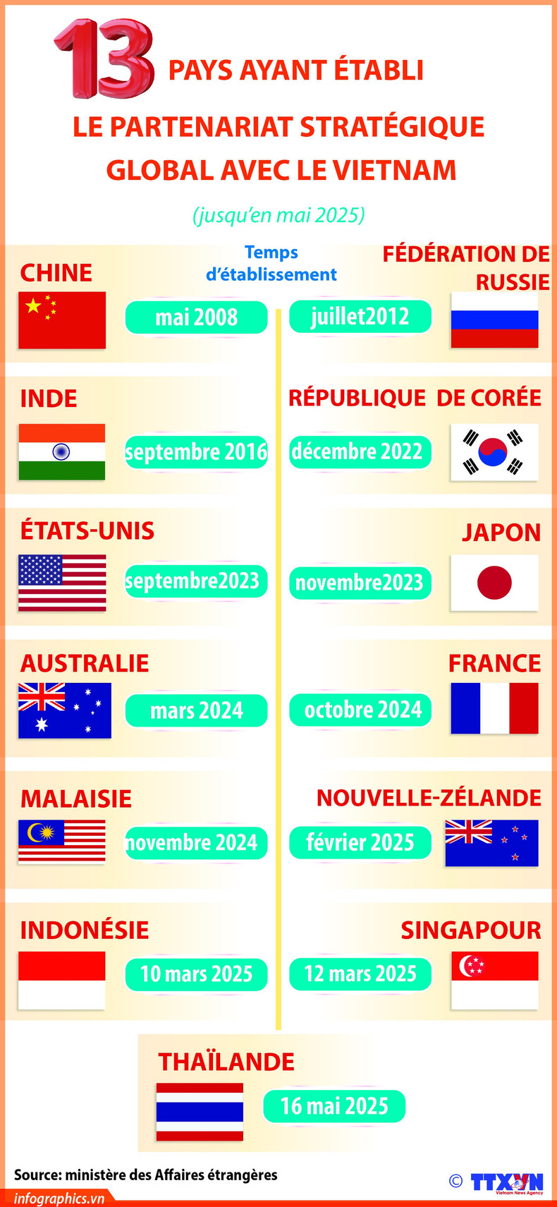 Le 16 mai 2025, à l’occasion de la visite officielle au Vietnam de la Première ministre du Royaume de Thaïlande, Paetongtarn Shinawatra, les deux pays ont décidé d’élever leurs relations bilatérales au niveau de Partenariat stratégique global. Ainsi, au 16 mai 2025, le Vietnam entretient un partenariat stratégique global avec un total de 13 pays.
