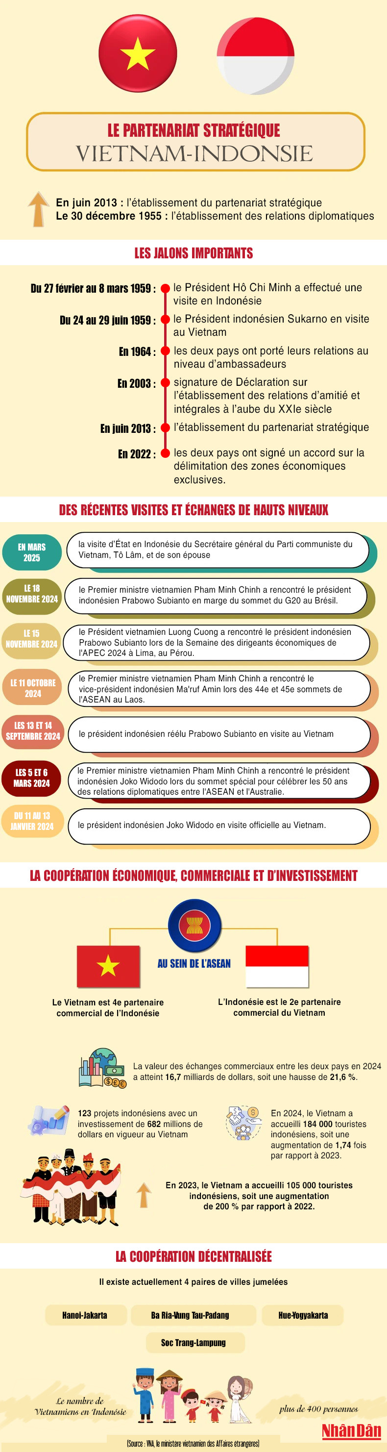 Établies sur les fondements solides de l’amitié traditionnelle établie par les Présidents Hô Chi Minh et Sukarno, et continuellement entretenues par des générations de dirigeants et de peuples des deux pays, les relations de coopération entre le Vietnam et l’Indonésie sont devenues de plus en plus complètes et profondes au cours des 70 dernières années.
