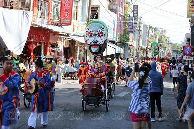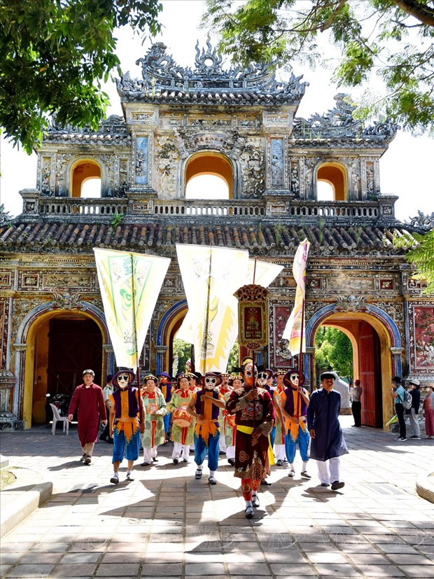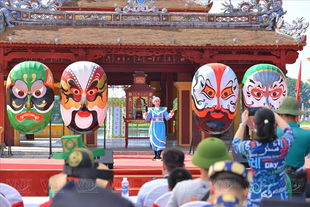 | Des artistes participent à un spectacle de rue pour promouvoir le tuông royal de Huê. Photo : VNP. |