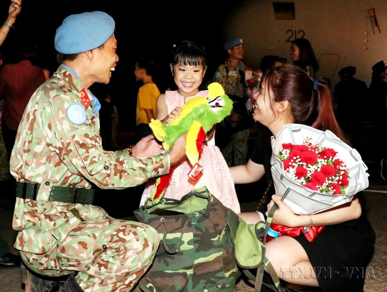 La joie d’une famille d’un soldat ayant terminé sa mission de maintien de la paix au Soudan du Sud. Photo: VNA.