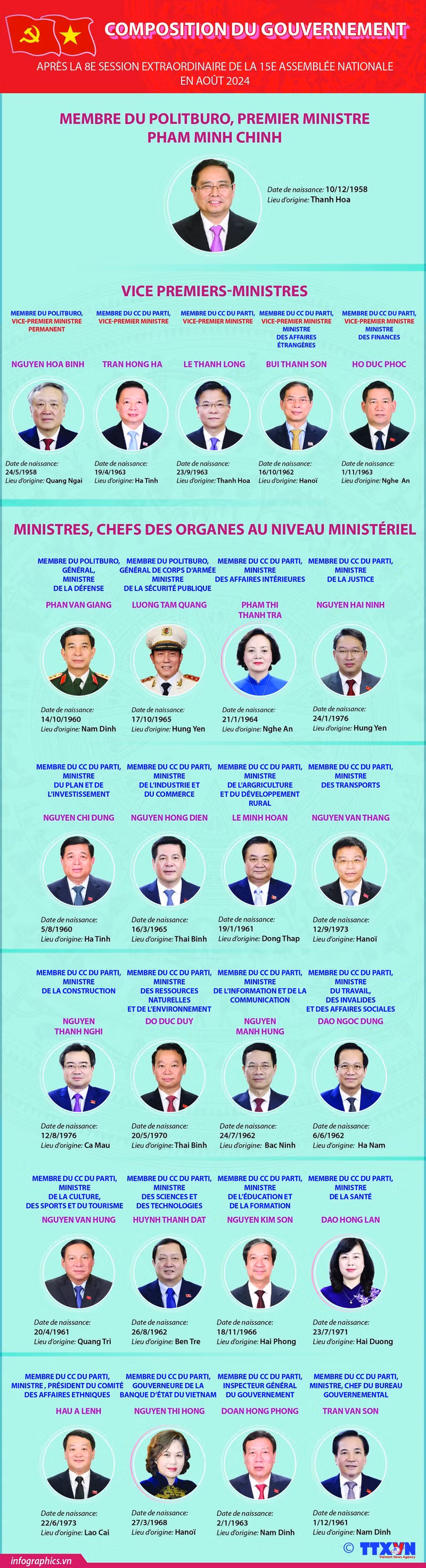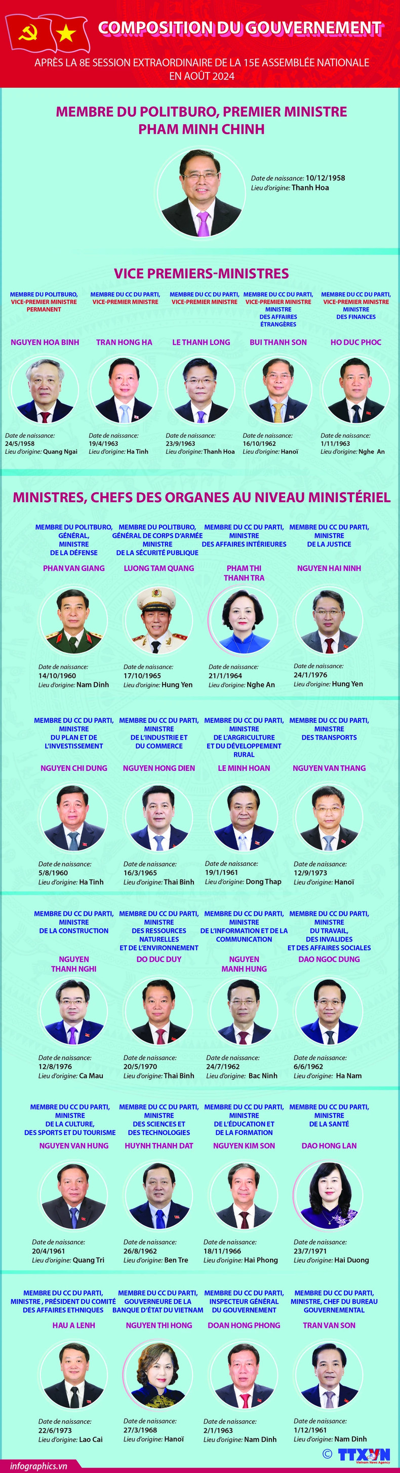 Après la 8ème session extraordinaire de la 15e législature de l'Assemblée nationale tenue le 26 août 2024, le gouvernement pour le mandat 2021-2026 compte actuellement 26 membres dont le Premier Ministre, cinq vice-Premiers Ministres et 20 ministres et chefs des organes.