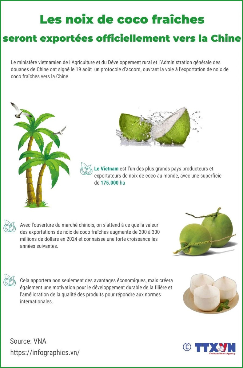 Le ministère vietnamien de l’Agriculture et du Développement rural et l’Administration générale des douanes de Chine ont signé le 19 août un protocole d’accord, ouvrant la voie à l’exportation de noix de coco fraîches vers la Chine.
