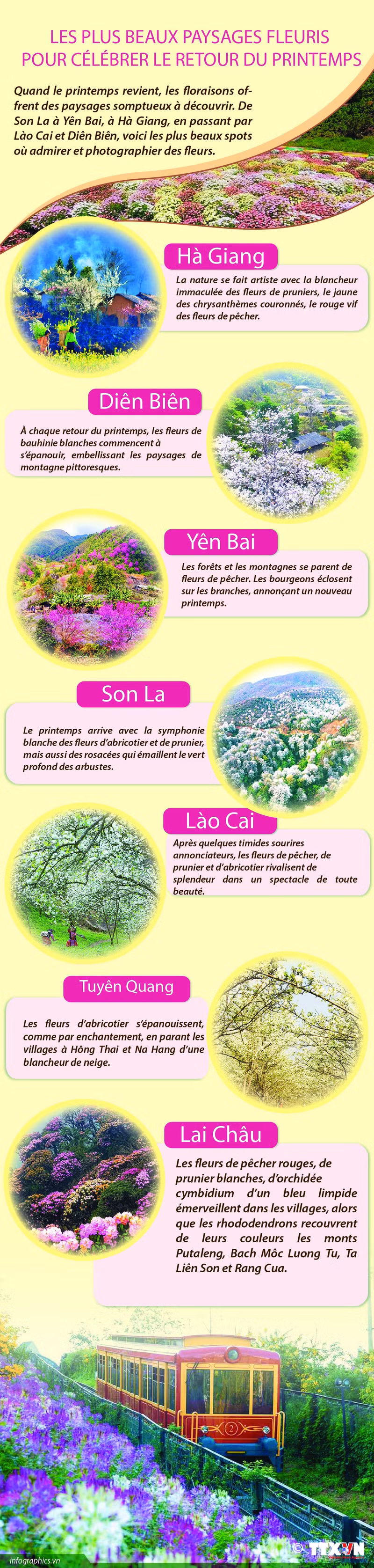 Quand le printemps revient, les floraisons offrent des paysages somptueux à découvrir. De Son La à Yên Bai, à Hà Giang, en passant par Lào Cai et Diên Biên, voici les plus beaux spots où admirer et photographier des fleurs.