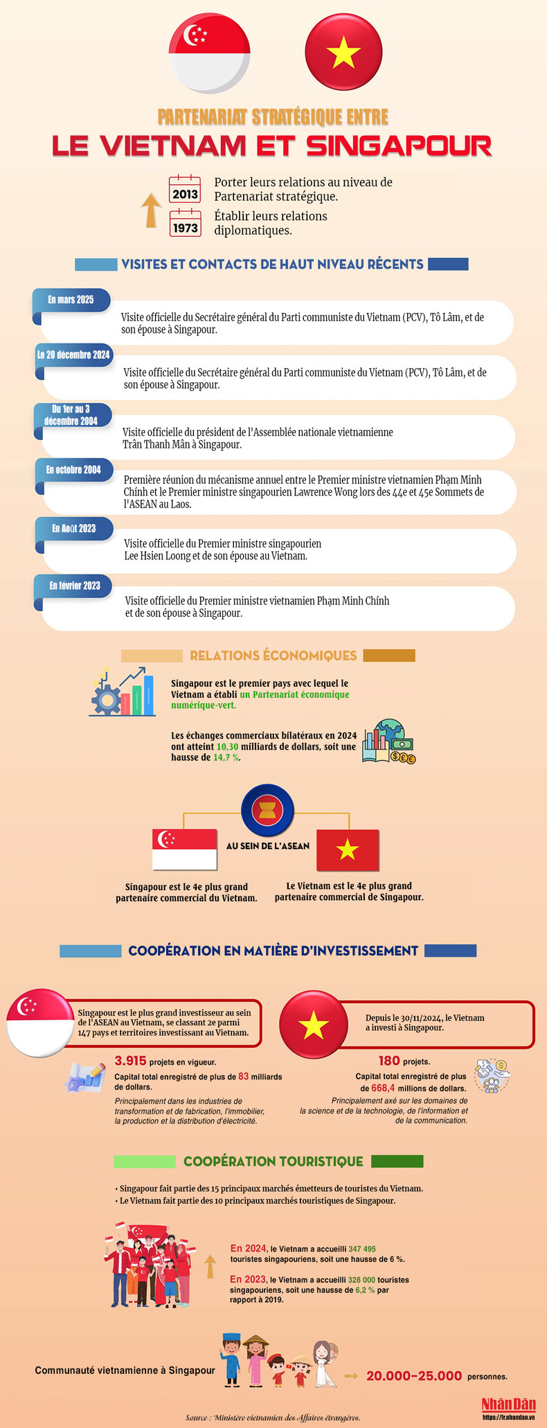 Les relations entre le Vietnam et Singapour sont excellentes, avec une confiance politique de plus en plus renforcée, une coopération économique et d'investissement étroite, et des échanges populaires solides, qui servent de moteur pour que les deux pays portent leurs relations bilatérales à une nouvelle hauteur.